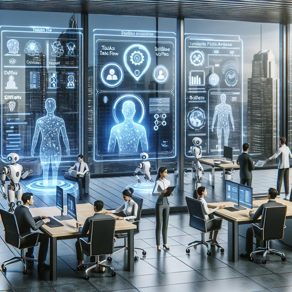 Équipe au bureau avec écrans de profils et compétences, illustrant l’attribution de tâches par IA selon la disponibilité.